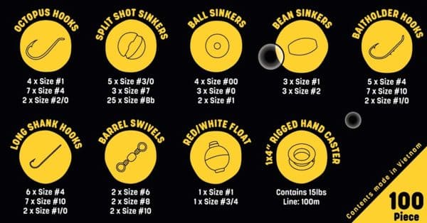 The Splash Ratz 100-piece Fishing Tackle Kit comes with a fun assortment of hooks, swivels, sinkers, and other essentials, making it the perfect starter kit for kids to dive into the world of fishing. The 1 Tray box features tough composite plastic construction and weather/bait/dirt proof materials. The Drawtite latch and Tip-Guard tray guarantee you won’t be fishing your gear out of the water.
