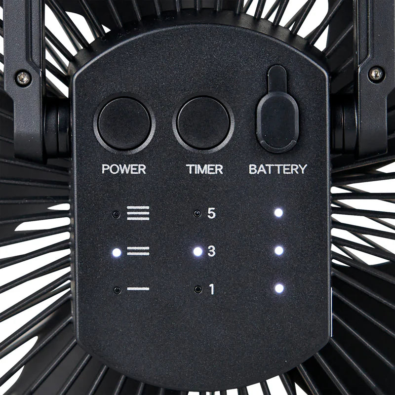 - Indicator lights show fan speed, timer, and battery level.