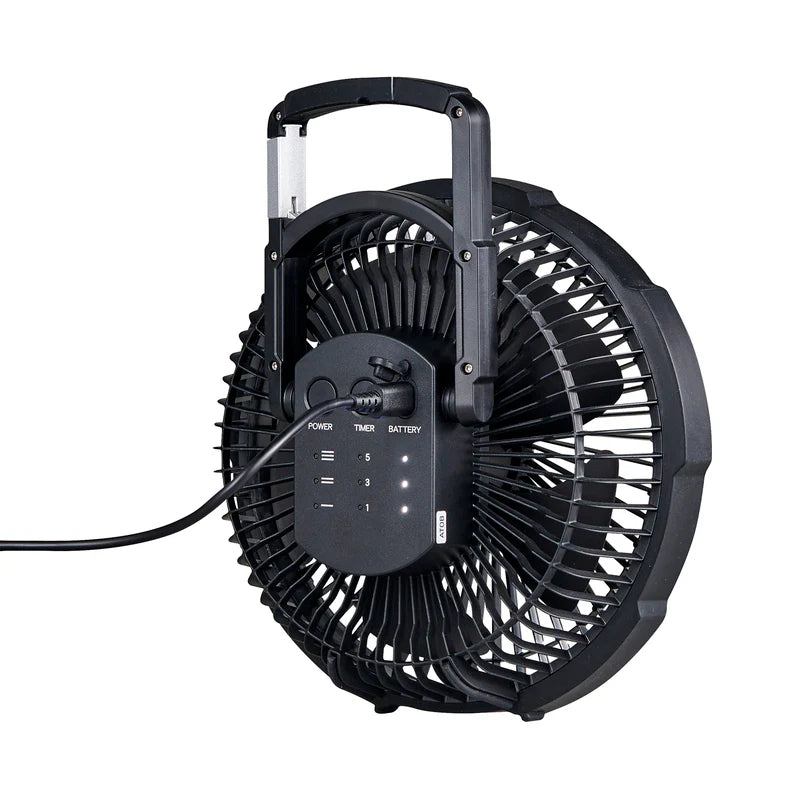 Designed for ultimate flexibility, the Aerobreeze Anywhere Fan is built to go wherever you do. With a 2-in-1 stand and hanging hook system, it can sit securely on a table or hang easily inside a tent, swag, or anywhere you need cooling comfort. The fan head pivots 180 degrees, giving you complete control over airflow direction. Choose from four speed settings to match your needs, and set one of three pre-programmed timers - or let it run continuously. Clear indicator lights show your selected speed, timer setting, and battery level at a glance. Powered by a 3,000mAh rechargeable lithium battery, it's perfect for off-grid adventures. Built tough with ABS plastic and a protective rubber guard, it’s made to handle life on the road.