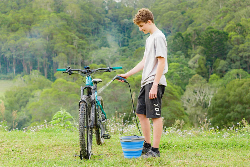 With the pump built into the ergonomic handle and a built-in filter at the hose end, you simply drop the hose into any water source like a bucket or tub - no bulky plumbing or complicated setup required. Perfect for rinsing off sandy feet, muddy boots, surfboards, dishes, pets and more.