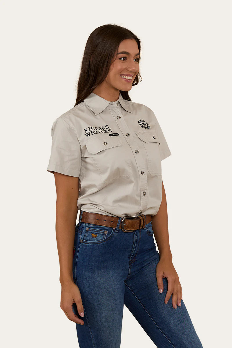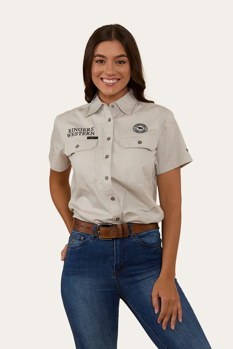 Ringers Western Womens Signature Jillaroo Full Button Short Sleeve Work Shirt - Beige / Navy