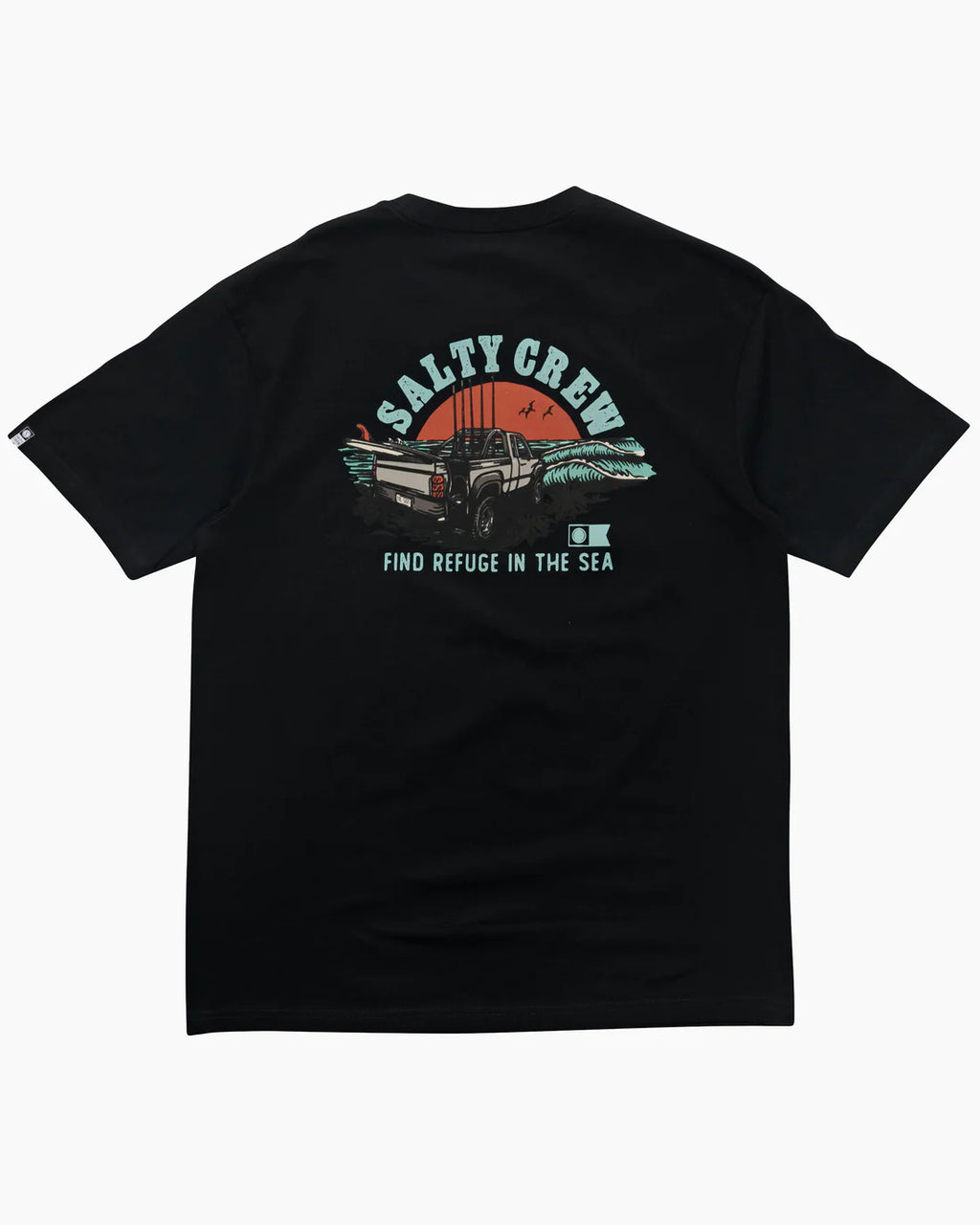 The Lifted Premium SS Tee in Black is crafted from ring-spun cotton jersey, weighing 160gsm. It features a Salty Crew clamp label at the sleeve hem and is finished with screen-printed designs on both the front and back for a clean, stylish look.