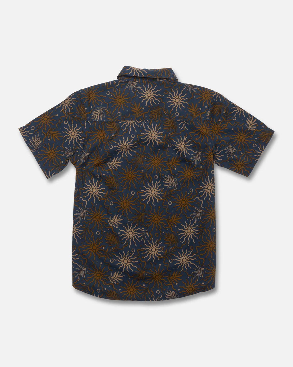 The Session Boys Button Up Shirt in Midnight Navy is a short-sleeve shirt crafted from a mid-weight cotton-blend fabrication with an all over yardage print. It features a two-piece collar, a left chest pocket with woven label, and branded resin button closure.
