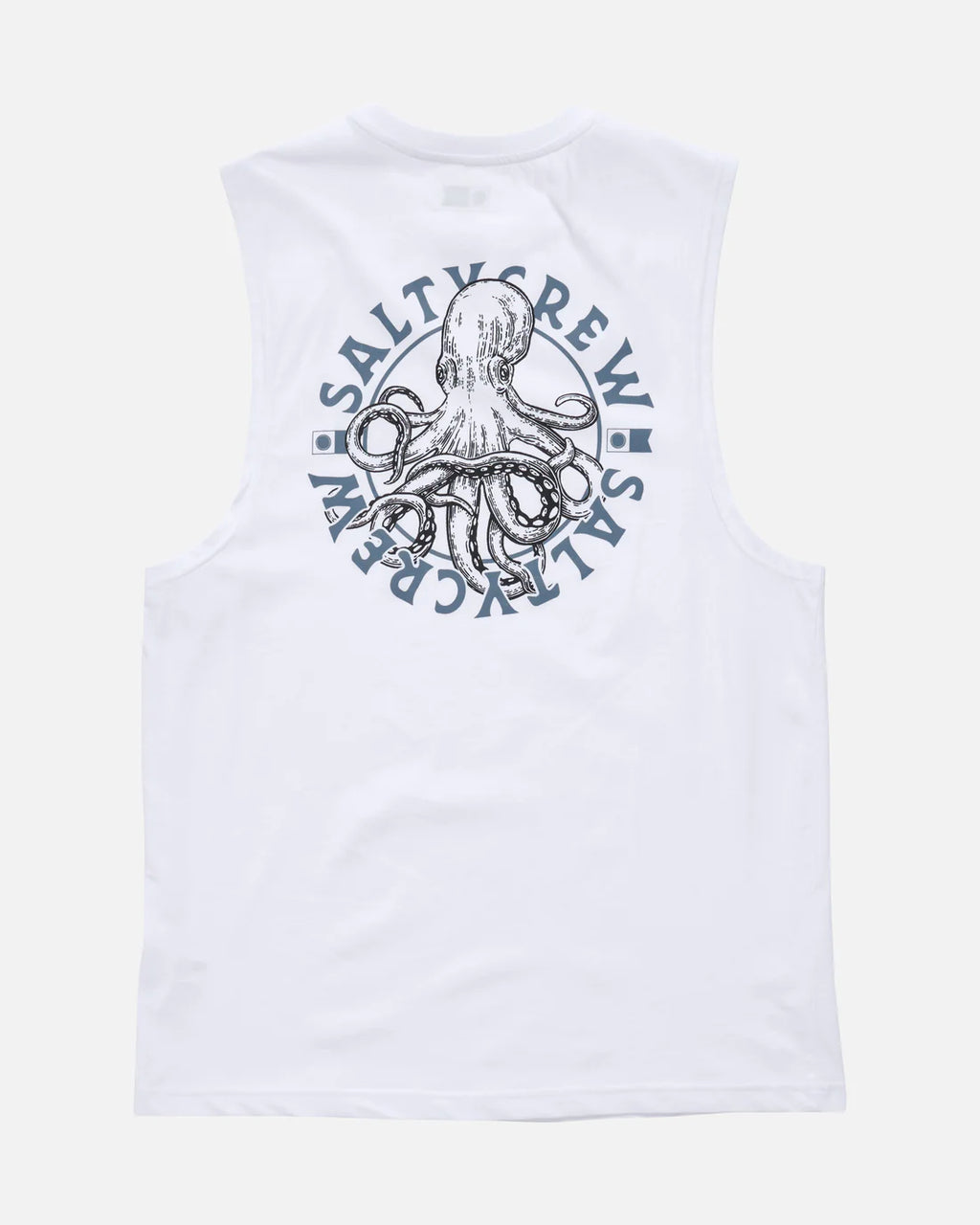 The Tentacles Muscle Tank in White is made from 160gsm ring-spun cotton jersey. It features a Salty Crew clamp label at the body hem and screen printed graphics on the front and back.