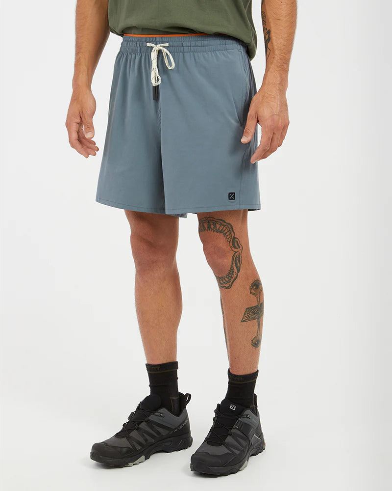 Jarrah Mens Shorts keep you cool from trail to tide. Key features: 50% organic cotton / 42% recycled polyester / 8% spandex, quick-dry stretch fabric, PFAS-free DWR, contrast tie waist with elastic comfort lining, mesh-lined pockets with drainage, zip stash pocket with cord pull, Velcro back flap pocket, carbon neutral. Eco performance meets casual style.